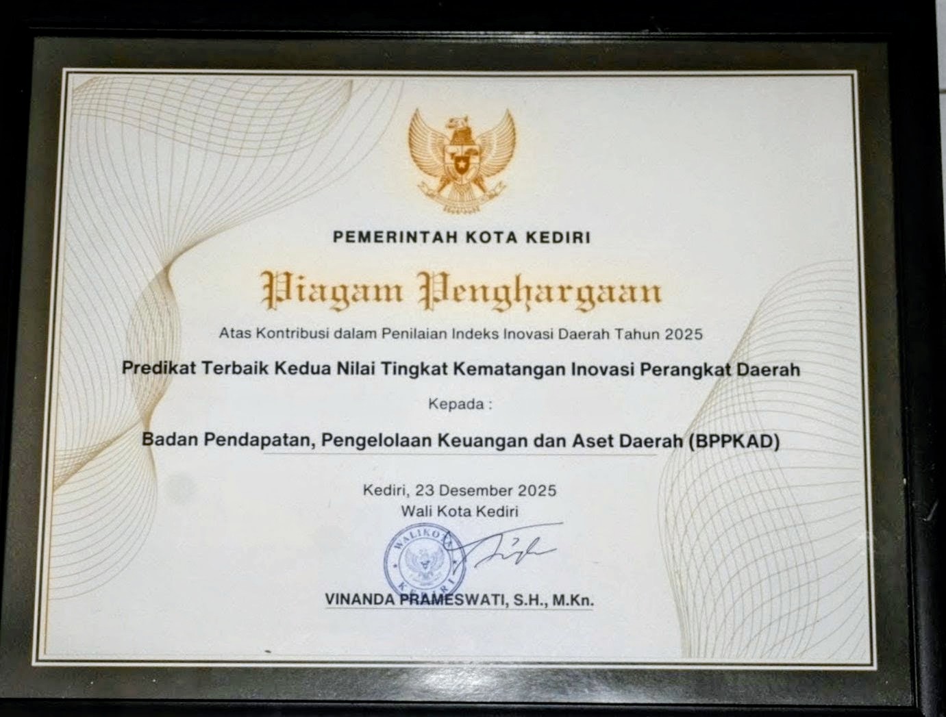 Penghargaan ini diberikan oleh Wali Kota Kediri, Vinanda Prameswati, sebagai bentuk apresiasi atas kontribusi BPPKAD dalam mendorong pengembangan dan implementasi inovasi di lingkungan perangkat daerah.